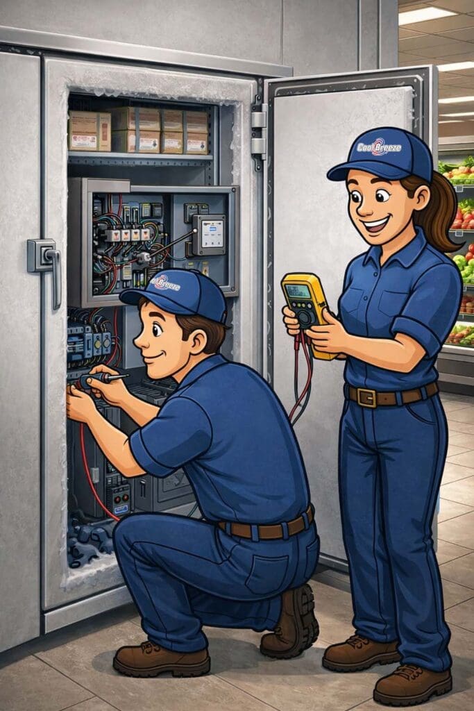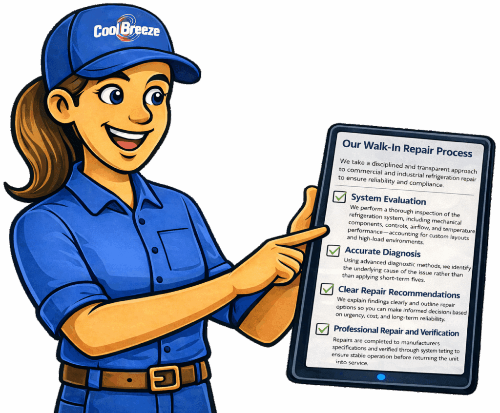 Cool Breeze Heating Air Conditioning & Refrigeration responds promptly to commercial and industrial walk-in freezer and cooler repair requests, including custom-built units and large-capacity cold storage systems, to help minimize downtime and protect inventory. Our technicians arrive prepared with the tools, experience, and diagnostic capability needed to address issues efficiently and accurately.